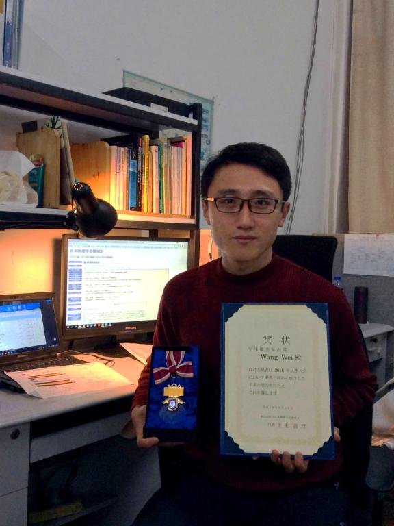 近日,在日本物理学会(JPS)2016年秋季大会中,我校物理学院等离子体专业博士生王玮获得了本年度日本物理学会优秀发表赏(奖)。日本物理学会创建于1877年,130年间共涌现出11位诺贝尔物理学奖获得者。优秀发表赏(奖)项旨在表彰于物理学各个领域取得突出进展的在读博士研究生,每个领域最终仅遴选出4人。本届大会共有超过5000名参加者,会议报告及展板总计3600余件。评奖过程首先由会议期间通过不记名投票对1000余场报告进行初选,并最终送于会议组委会通过讨论产生。王玮同学还被邀请参加了获奖后由日本物理学会主办的恳谈会(宴会活动)。本次王玮获奖是该奖项在近三年内唯一一次由中国人获得。