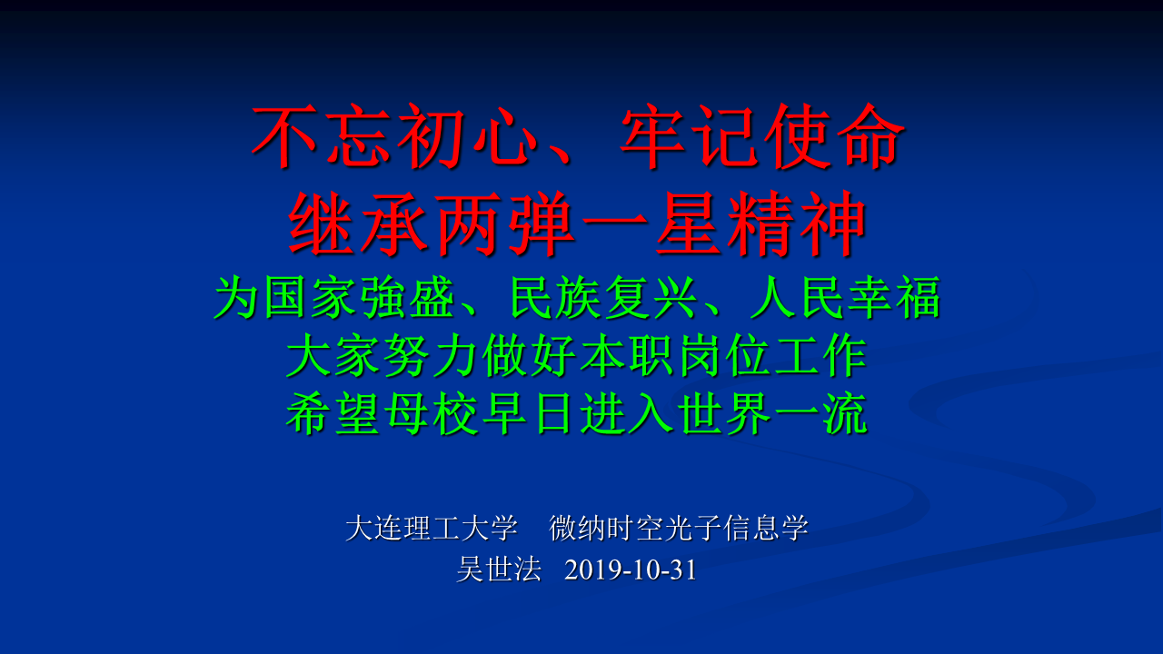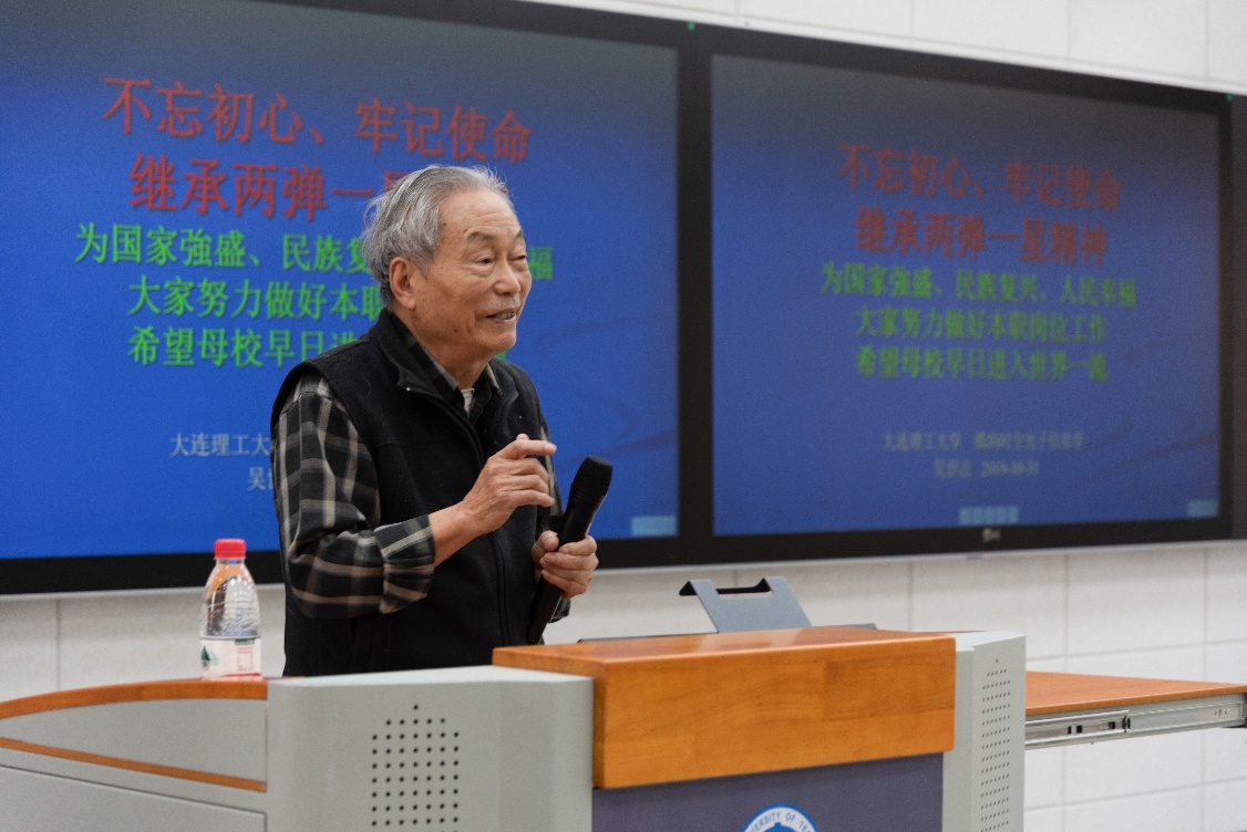 为进一步落实学校及学院“不忘初心、牢记使命”主题教育方案,丰富学习形式,积极开展革命传统教育、先进典型教育,突出“以身边榜样教育身边党员、以身边事感染身边人”,物理学院邀请到我国第一颗原子弹研制工作主要参加者、学院退休教师吴世法教授,于10月31日下午在材料馆201党建智慧教室开展《继承两弹一星精神 不忘初心 牢记使命》集中党课活动。