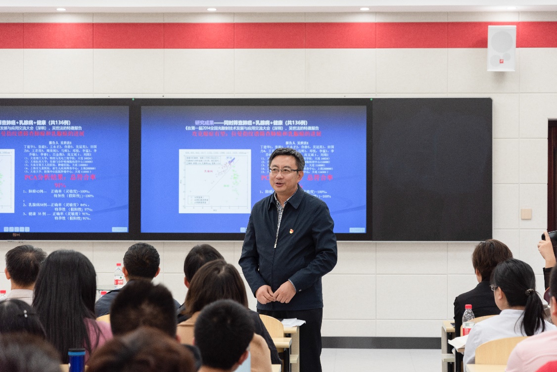 在党课的末尾,吴世法教授“出人意料”地对照“不忘初心、牢记使命”,做了一次自我检查,回顾了自己自成年至今的共产主义信仰之路,并结合自己当前的研究方向,建议学校率先实施I期肺癌与乳腺癌筛查的‘拉曼血检’研究项目,为师生员工建立“个人健康-拉曼光谱档案”,争取领先世界地拿出一个可以推广的模板。吴教授这一毕生忠诚向党、心系国家人民的举动,让现场响起了最热烈的掌声。