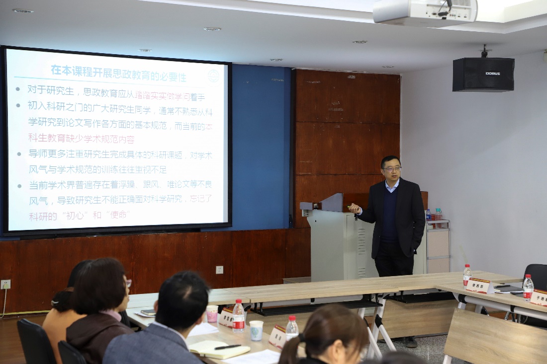 开云手机站登录入口院长赵纪军在会上做《“学术规范与写作”校级课程思政示范课经验介绍》报告,结合“弘扬科学精神、提升学术品味、普及学术规范、恪守学术道德”四个课程核心理念,详细讲解了该门课程的主要内容与目标效果。