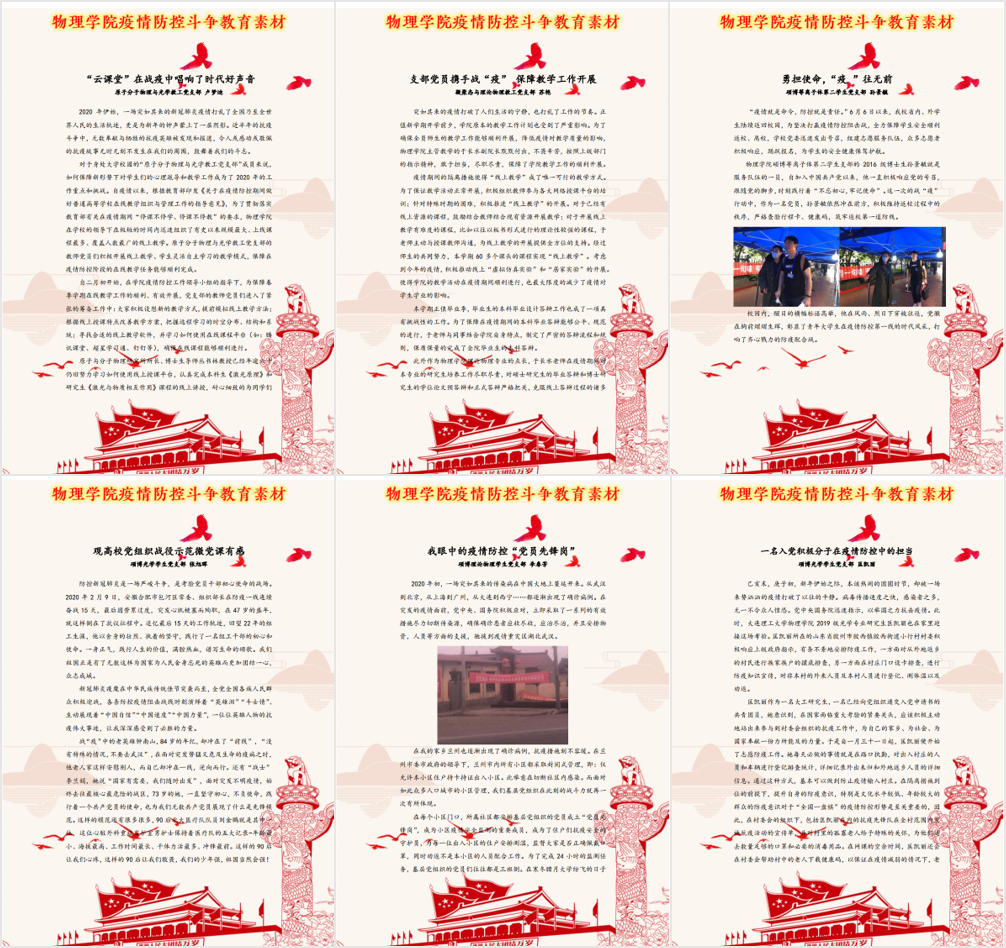 6月20日以来,在学院党委的部署下,物理学院各师生党支部先后开展主题党日活动,围绕疫情防控的特定主题召开专题组织生活会,举办微党课活动。学院党委号召党委委员、党支部书记、研究生党支部第一书记(由青年教师党员担任)积极参与宣讲,各主讲人或着重讲解制度优势、文化优势、党的领导优势,或着重讲解抗疫前线的感人瞬间、身边同志的感人瞬间,或结合学科特色讲解相关研究在疫情防控中的应用等等,均取得良好的党课效果。