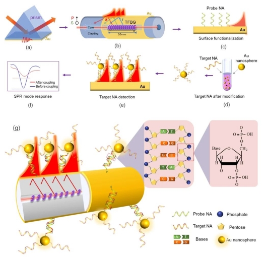 开云手机站登录入口先进光学与光纤传感技术团队的彭伟教授和张扬副教授与中国计量大学合作,联合通信作者身份在最新一期Biosensors and Bioelectronics(影响因子IF=12.6)上发表论文,介绍了一种基于倾斜光纤布拉格光栅(TFBG)的超灵敏核酸检测系统。该传感系统基于一种无标签光纤表面等离子共振(SPR)的生物传感器,相较于公认的Kretschmann-Raether棱镜等体棱镜结构,具备更低成本、小型化及临床快速检测应用(POCT)的优势。在这一传感系统中,TFBG发射的包层模式在光纤包层上的薄金涂层中诱导表面等离子体共振,实现了对NA的超灵敏检测和超低限的检测能力。该技术突破了传统无标记光纤生化NA传感的极限,实现了从aM到pM(10^-18到10^-12M)的大动态检测范围,以及10^-18M最低检测限(LOD),是目前报道的光纤核酸检测传感器中最低的检测极限。