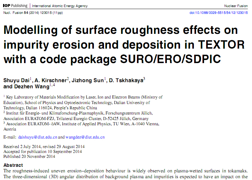 近日,物理学院青年教师戴舒宇关于核聚变装置中粗糙表面上杂质输运和沉积的三维模拟研究成果最终发表在国际核聚变领域最具权威期刊《核聚变》(Nuclear Fusion)。这篇文章经过4位审稿人的严格评阅,最后得到了他们对工作的一致肯定,其中一位审稿人还给出了"excellent paper"的评价。这项研究成果的开展是建立在之前的二维模型基础上开展的(Dai S Y et al 2013 PPCF 55 055004),该二维模型的文章被欧洲同行多次引用;最新的三维模型的模拟结果与TEXTOR和Tore Supra等聚变装置上的实验结果有很好地吻合,这也为后续的工作的开展打下了良好的基础。此外,该项工作也得到了王德真教授和孙继忠教授的支持和帮助。《核聚变》期刊是由国际原子能机构主办的可控核聚变领域的顶级杂志。我国每年在该期刊发表的文章在10篇左右,并且主要以实验文章为主。本研究工作得到了ITER专项基金、国家自然科学基金、中国博士后科学基金、辽宁省高等院校科学研究项目的联合资助。