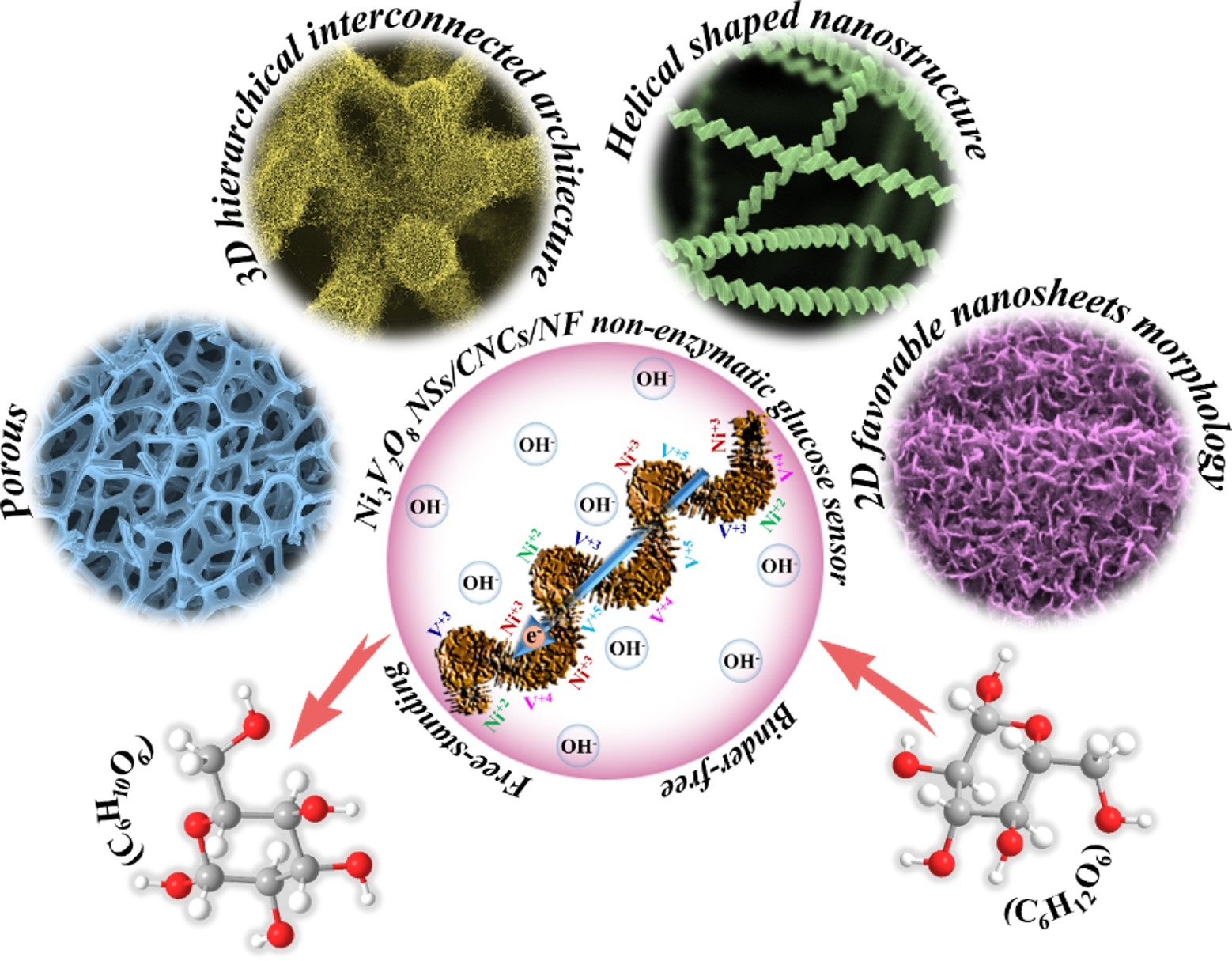 近日,我校物理学院潘路军教授课题组在高效葡萄糖检测的新型非酶葡萄糖传感器(NEGS)研究上取得突破性进展,相关成果“Ni3V2O8Nanosheets Grafted on 3D Helical-shaped Carbon Nanocoils as A Binder-free Hierarchical Composite for Efficient Non-enzymatic Glucose Sensing”在国际期刊Advanced Functional Materials上发表。研究成果对于定量、可靠的葡萄糖检测、糖尿病管理以及生物技术、制药、食品加工等领域都具有重要意义。