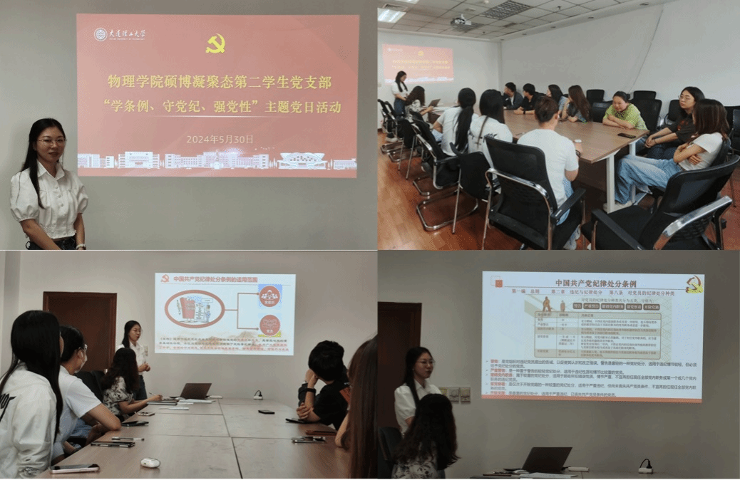 当前,全党正在深入开展党纪学习教育,为加强支部全体党员的党性修养和纪律意识,物理学院硕博凝聚态第二学生党支部于2024年5月30日下午,在科技园C座510会议室召开党员大会暨“学条例、守党纪、强党性”主题党日活动,本次会议由支部书记杨秋萍同志主持,支部全体党员参会。
