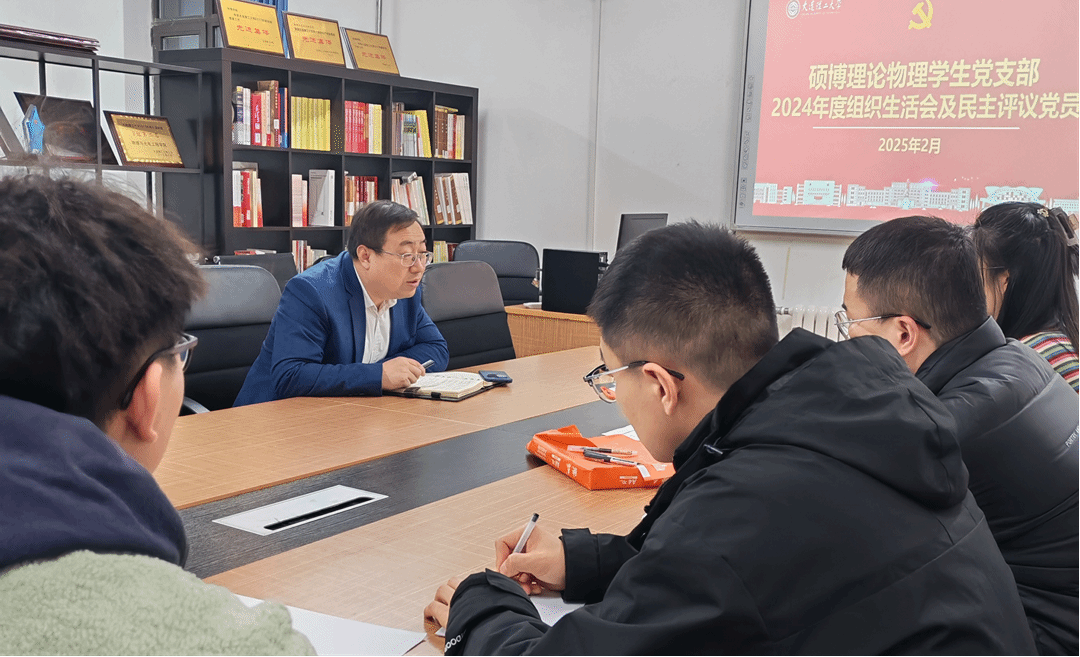 为深入学习贯彻党的路线方针政策,加强党组织建设,进一步推动全体党员的思想觉悟与行动相统一,物理学院硕博理论物理学生党支部于2月27日晚在物理楼422室召开了2024年度组织生活会暨民主评议党员大会,本次会议通过批评与自我批评、领导点评等环节,全面推动思想建党与制度治党同向发力。本次会议由支部书记韩钰芬同志主持,学院党委书记于长水教授莅临指导,支部全体党员参会。