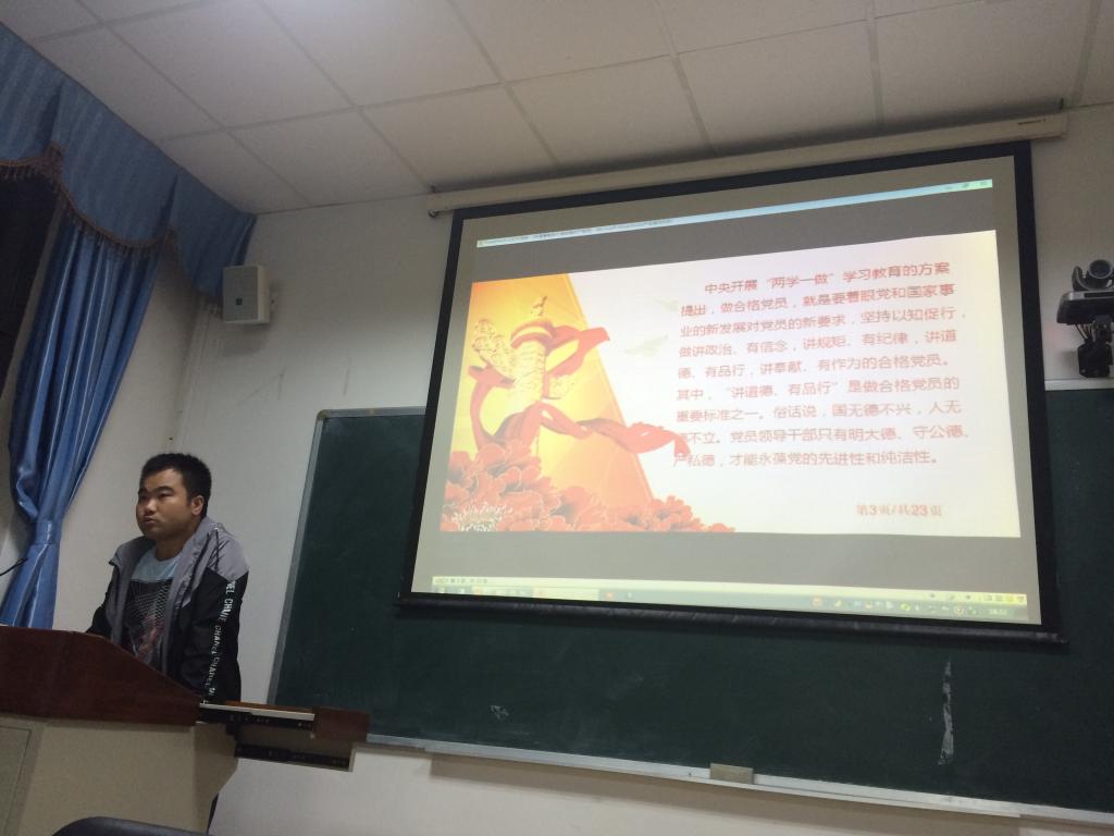 接着,朱霄龙同志从三个方面诠释了“讲道德,有品行”的时代意义,以及共产党员如何做到“讲道德,有品行”。胡艳婷同志通过“周恩来”和“杨善洲”这两名优秀共产党员的事迹,展示了一名共产党员应具备的道德品质,并倡议全体党员同志向优秀的党员模范学习。樊智慧同志和高丽红同志从不同角度出发,清晰、细致地讲解了道德的基本内涵,并分享了他们对于党员同志如何在现实生活中做到“讲道德,有品行”的建议和意见。