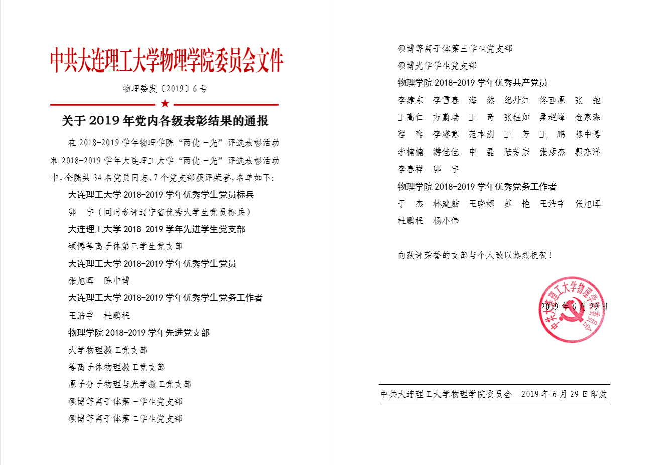 结合学校在全校学生党员中开展的“两优一先”评选表彰活动,物理学院党委相应开展了学院层面的2018-2019学年“两优一先”评比活动,经各师生党支部及党员个人申报,共评选出学院优秀共产党员26名、优秀党务工作者8名、先进党支部7个。