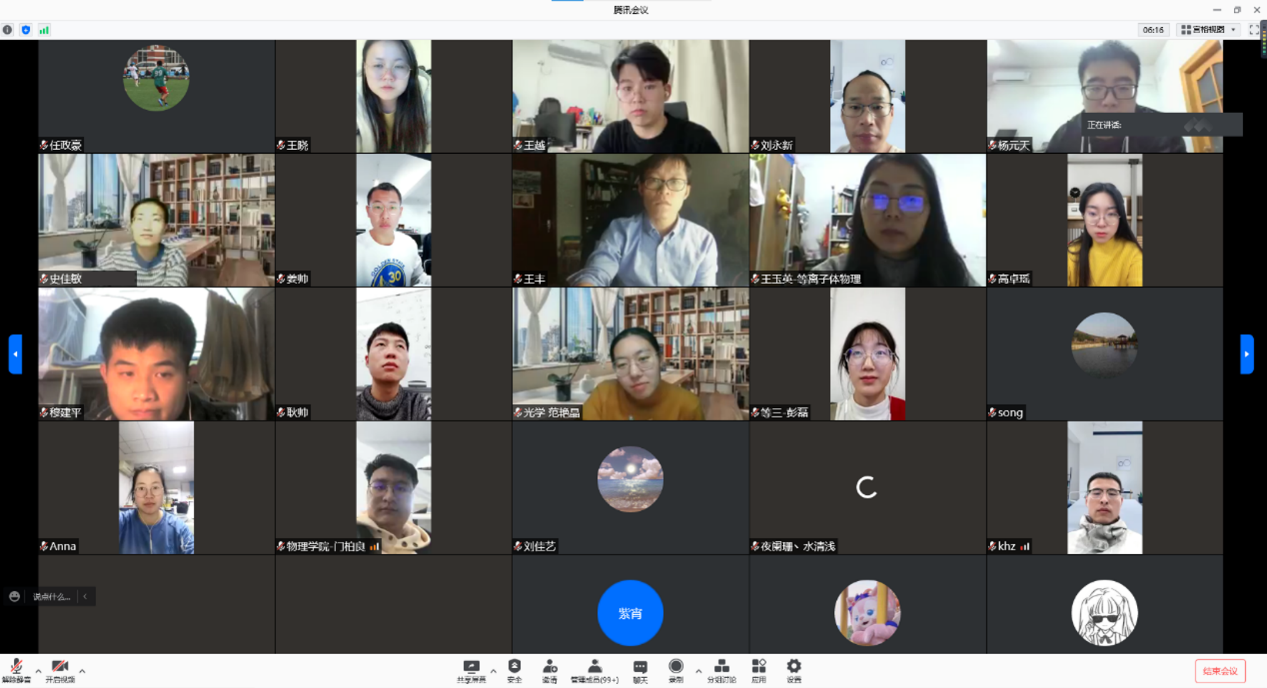在学习党的十九届六中全会内容与精神后,物理学院党委书记王正汹教授、副院长高飞教授、桑超峰教授等针对各党支部书记收集的关于同学们在疫情封校后的调查问卷反应的问题作出耐心解答并提出可行性解决方法。特别是关于封校期间研究生遇到的科研问题、心理状况、与导师、师兄、师姐的沟通交流,课程及考试情况,食堂和校内水果超市的价格问题,实验室的卫生清洁问题,系楼4楼水房的热水器维修和校车等问题,老师们均对问题给予细致的解释,充分理解同学们目前所面对的困难。与此同时,王正汹书记希望党员同学发挥模范先锋的带头作用,鼓励同学们通过运动释放压力,积极与导师线上交流,解决学术上的问题。最后,王书记鼓励同学们要调整好心态,整理好心情,打起精神,投入到学习中去。在艰难困苦的磨练下,才能更快得成长。