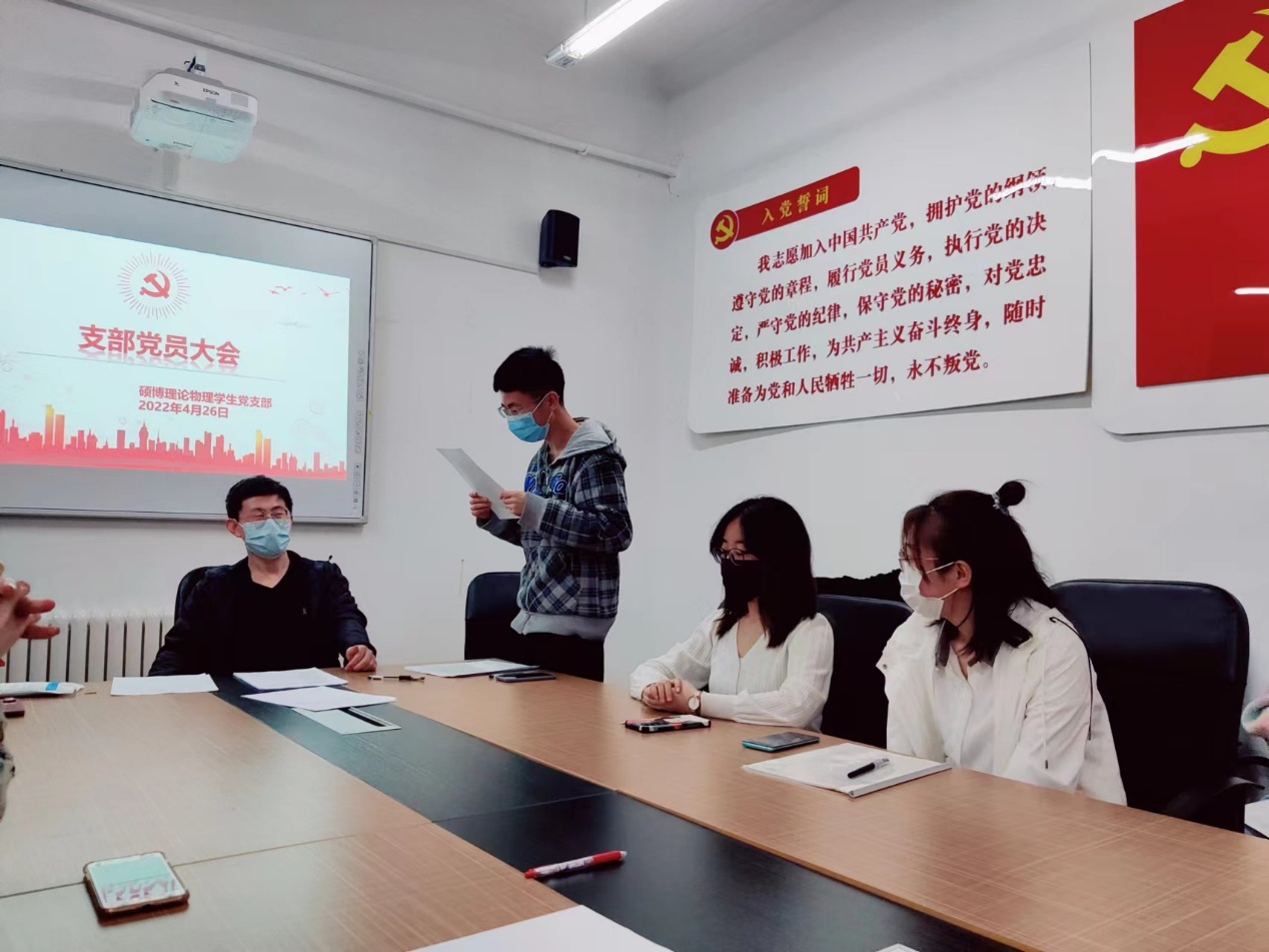 在疫情形势仍然复杂严峻的当下,为深入学习习近平总书记3月17日关于统筹疫情防控和经济社会发展精神,不断提高政治站位,坚定政治立场;深入学习中国共产党人的精神谱系,坚持思想上学习不放松,切实提高思想觉悟;加强支部力量建设,积极为党组织吸收新鲜血液。硕博理论物理学生党支部支部于2022年4月26日召开全体党员大会。会议由支部书记刘玉强同志主持,全体党员,发展对象,积极分子和部分群众参加。会议分为三项,第一项为“弘扬伟大抗疫精神和东北抗联精神”主题党课学习;第二项为预备党员转正事宜;第三项为确定发展对象相关事宜。