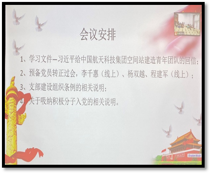 为加强党员队伍建设,积极开展发展党员工作,不断吸收优秀的新鲜力量,2022年6月5日上午10:00,硕博等离子体第一学生党支部在老机械楼152举行党员大会,由于疫情原因和部分党员临近毕业,部分党员在线上通过腾讯会议参加会议。本次会议主要包括三项议程:会议第一项由杨双越同志带领全体党员集中学习习近平总书记给中国航天集团空间站建造青年团队的回信;会议第二项讨论李千惠、杨双越、程建军同志按期转正事宜;会议第三项支部书记崔紫宵同志重申和明确支部组织建设的条例和吸纳积极分子入党的要求。