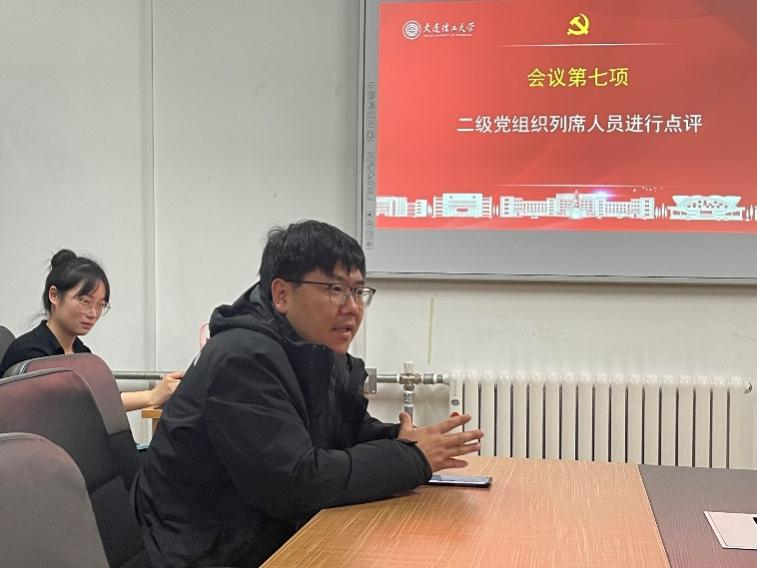 会议第三项,全体党员开展批评和自我批评,党员结合自身实际找问题进行自我检查和剖析,谈不足和今后的努力方向,其他党员对其不足之处提出批评意见,全体党员虚心接受批评意见,表示在今后的工作中要不断学习提高自身党性觉悟,起好先锋模范作用。在所有党员批评与自我批评结束后,高飞老师对此次会议作出总结发言。高飞老师指出,党员们要注意反思自己去年的问题是否得到整改,要做到目标导向,制定适合自己的目标,提高自身的效率。同时作为党员要起到先锋模范作用,对于实验室、教研室的卫生问题进行主动协调,希望同志们在接下来凝聚全体党员的力量,积极展示支部的整体精神面貌。支部书记段蒙悦表态,对于此次组织生活会查摆出的问题坚决整改到位,在2023年落实党员同志们和高飞老师提出的意见建议。