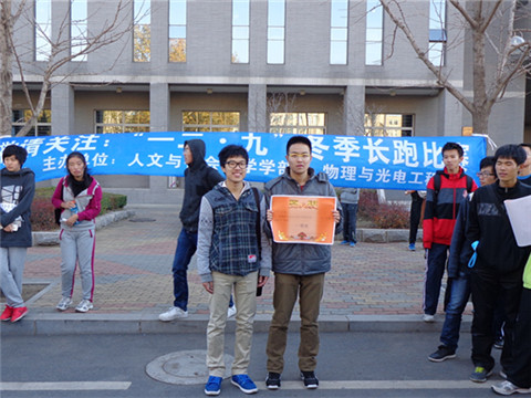 为加强同学体魄建设,丰富同学课余生活。11月20日下午,由人文与社会科学学部学生会体育部和物理与光电工程学院团学社体育部举办的“一二·九”冬季长跑比赛顺利进行。本次比赛的起点在毛主席像前,男女跑道略有不同,最终都回到起点。物理1203班荣获本次比赛一等奖,物理1305及1303荣获二等奖,物科1201,物理1304及1206荣获三等奖。男子个人前三名分别是汤桓,刘佳怀,高秉阳;女子个人前三名是董迪,赵艳秋,王静。