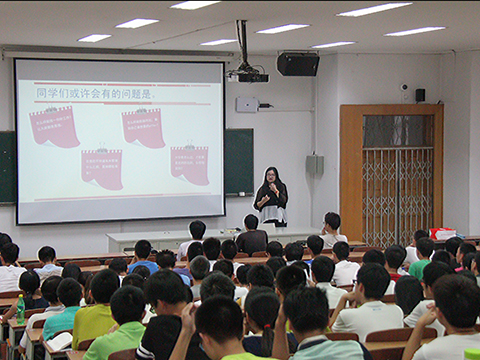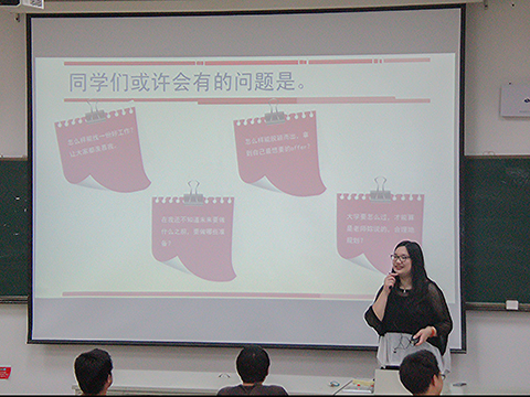 晚6点,教室早已坐满同学,讲座准时开始。王琳老师首先以“你认为什么是好工作”“为了得到这份工作现在要做什么准备”等几个问题开始讲座,几个问题虽简单却令人深思,同学们不禁进入思考。
