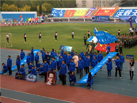 19日中午1点,运动会开幕式隆重召开。物理学院方阵的运动员身穿蓝色运动服,迈着矫健的步伐走过主席台。他们手中高举牛顿、爱因斯坦和薛定谔的头像,以及这三位科学巨人提出的公式,展现了物理学对人类的巨大贡献。同时,他们高呼“物理光电,真金火炼,奋勇争先,突破极限”的口号,表达了物理健儿在运动会上力争上游的决心。