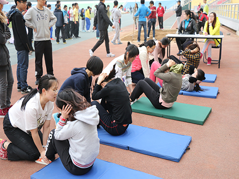 尽管天气有些寒冷,但是这丝毫不影响物理院队员们火热的竞技之心。赛前,队员们积极热身,互相探讨分析实力差距,互相鼓励加油,为比赛做着准备。进入到比赛场地,首先是男女立定跳远项目,每一个队员都神情专注地望着沙坑,将全身力量集中于一点,争取跳得更远。接下来是女生仰卧起坐,男生引体向上环节,裁判的一声令下,女队员们以最快的速度开始了比赛,随着时间一分一秒过去,所有旁观者都凝神闭气,异常安静,默默为她们鼓励着;而男生引体向上比赛也随之开始,每一位队员都在坚持,而其他队员和老师都在为他们大声呐喊加油。