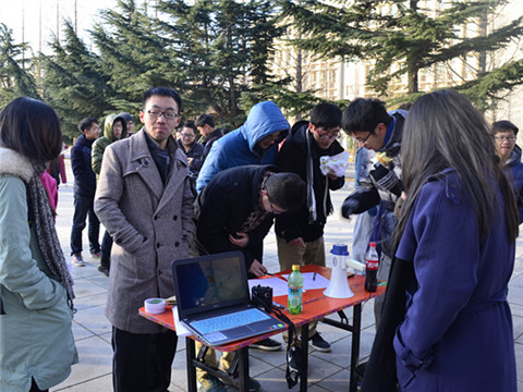 尽管入冬多日,室外已是非常寒冷,但同学们仍丝毫不减参与热情,一大早便来到了音乐喷泉广场等待活动的开始。与此同时,为了增加活动的趣味性与挑战性,“三一”的工作人员清晨便开始在寒冷的冬日里奔走在校园内的各个活动地点,放置梦想卡片、密码信封等项目道具。