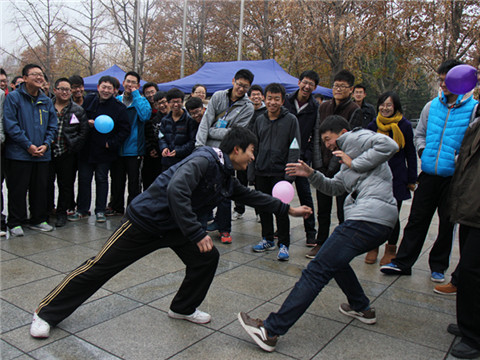 结束了让大家倍受考验的盲人摸绳的比赛,随后的“猜歌大战”和“撕铭牌”游戏似乎轻松愉快得多。先是有各组两人背夹气球又背持奔跑到台前来,猜出由工作人员只唱出两个字的歌的正确名字,欢笑声笼罩全场。后又有激烈而欢快的撕铭牌大战,现场火热的氛围让突然来袭的小雨也无法打断这场比赛精彩进行的步伐。