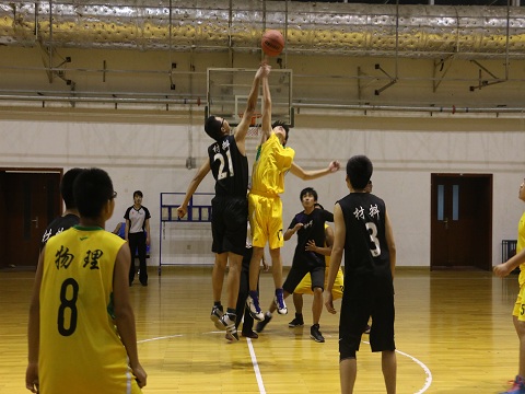 赛前,双方队员都进行了充分的热身准备。8点整,比赛正式开始。伴随着哨声的响起,现场气氛迅速攀升,双方很快进入激烈的角逐。第一节比赛中物理学院的队员凭借高昂的斗志和饱满的热情先拔头筹。时间一分一秒过去,队员们也渐入佳境。7号队员张赫的猛烈进攻与17号队员龙泽七个精准的三分球使比分逐渐拉大。在观众热情的呐喊助威声中,第一节比赛结束。