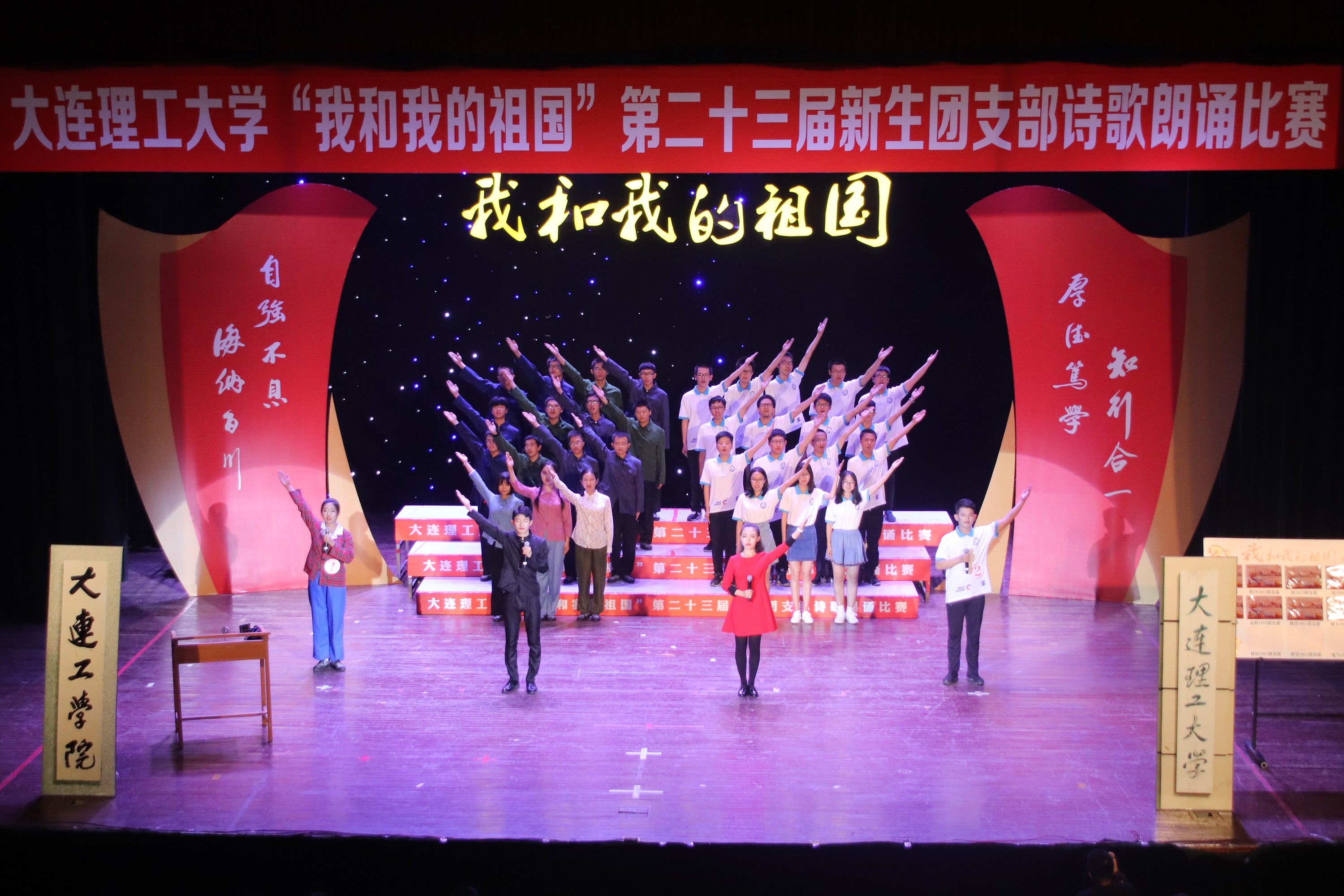 凌水河畔,秋风飒爽。2018年9月28日晚,由共青团大连理工大学委员会主办的“我和我的祖国”大连理工大学第二十三届新生团支部诗歌朗诵比赛在我校山上礼堂如约举办。作为我校新生入学红色基因教育的重要活动,物理学院的同学也是满怀壮志豪情,在校级的舞台上洋溢地展示出我院学生的精神风貌,为全体观众带来一个焕然一新的诗歌朗诵节目。