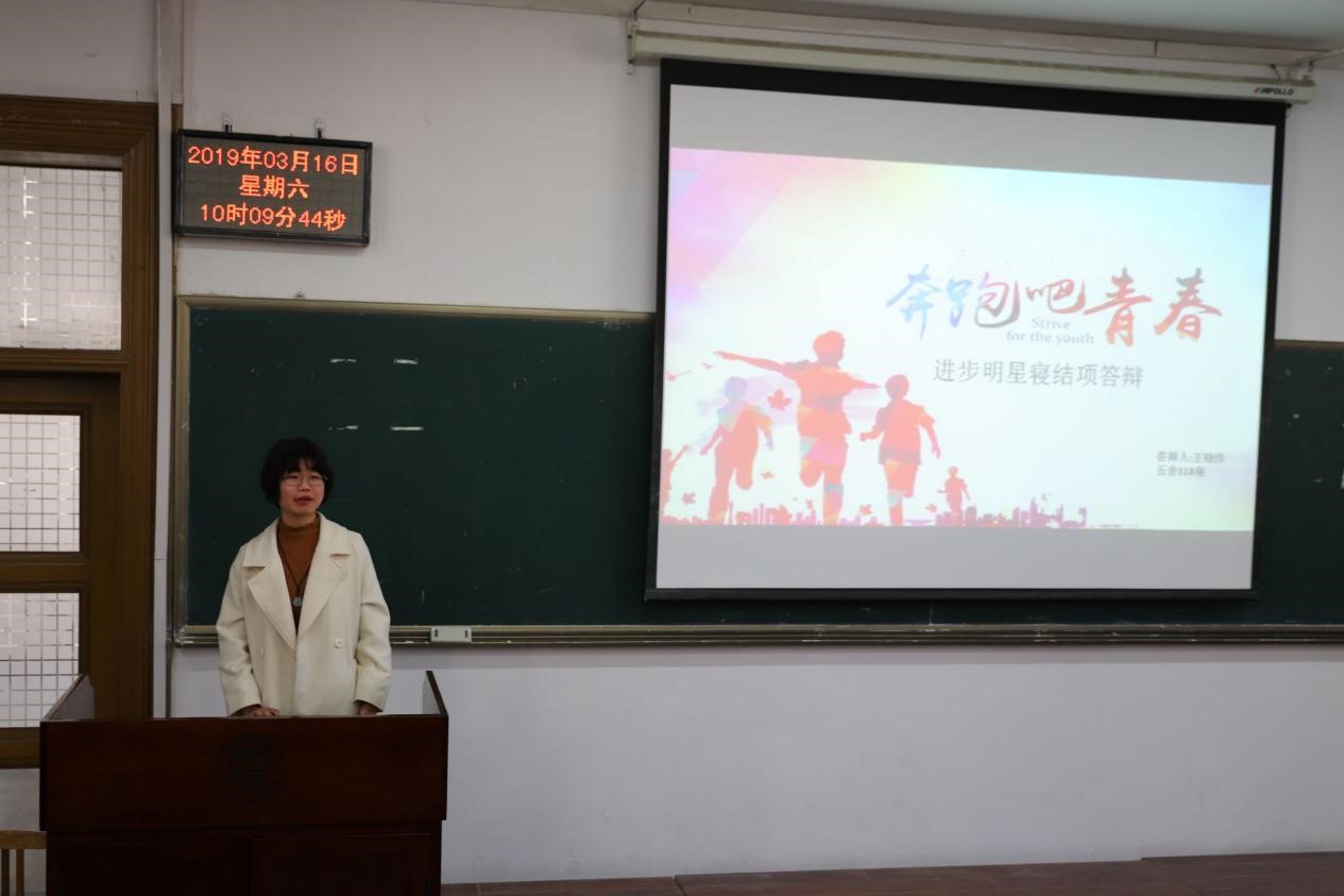 接下来,11间获评“优秀结项”的明星寝室代表分别进行了寝室建设汇报及经验交流。主要内容为成员介绍,寝室特点,遇到的问题,具体建设举措,给低年级同学的建议等。各位“明星寝室代表”围绕着自己寝室的特色称号,分别对寝室的成员构成、团结建设、特色建设等方面进行介绍,获评“优秀结项”的寝室各具特点、各有侧重,展现了学院学子携手同行的青春活力。