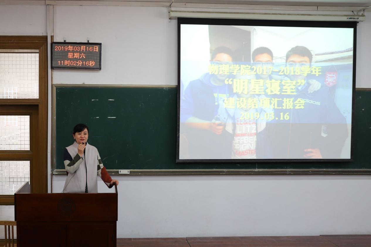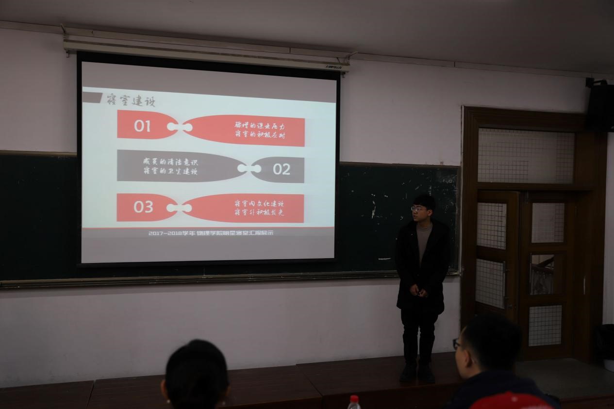 为深入推进学院基础文明建设工作,发挥学院育人工作特色,提升学生的集体凝聚力与归属感,物理学院于3月16日上午在二馆209教室举办2017-2018学年“明星寝室”建设结项汇报会活动。此次汇报会由2016级辅导员佟西原主持,学院党委副书记兼副院长杨木、学生工作办公室主任兼团委书记纪丹红,2018级辅导员杨帅兵作为嘉宾参会。