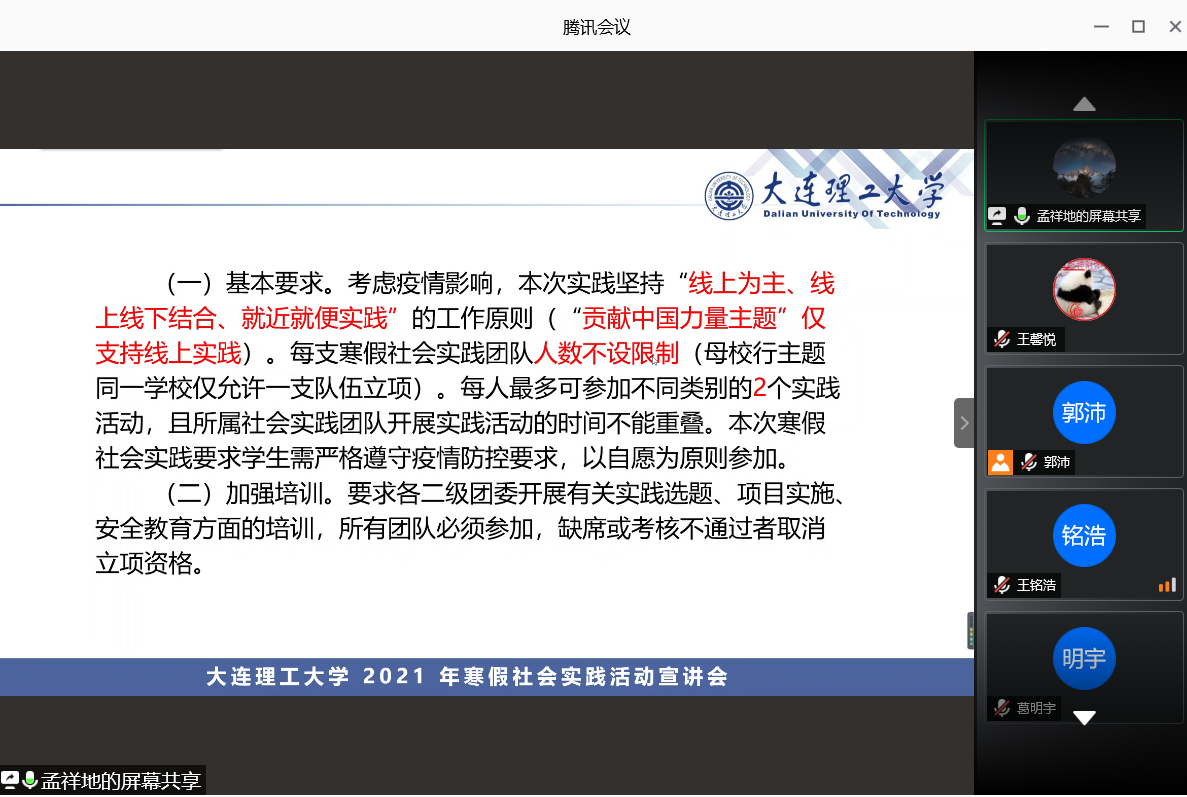 会议开始,孟祥地同学就向大家依次介绍9个寒假社会实践主题类别,详细讲述每个主题实践的相应内容和精神内涵。在疫情的特殊背景下,本次寒假社会实践还新增开设“共抗疫情贡献青春力量”的主题实践活动,挖掘身边抗“疫”先进人物的事迹和精神,创造抗击疫情的文化作品,赞颂抗“疫”英雄、传播抗“疫”故事。其次,孟祥地同学还讲解寒假社会实践的立项要求以及材料准备,并特地说明寒假实践的注意事项,让同学们能更好地开展寒假社会实践。