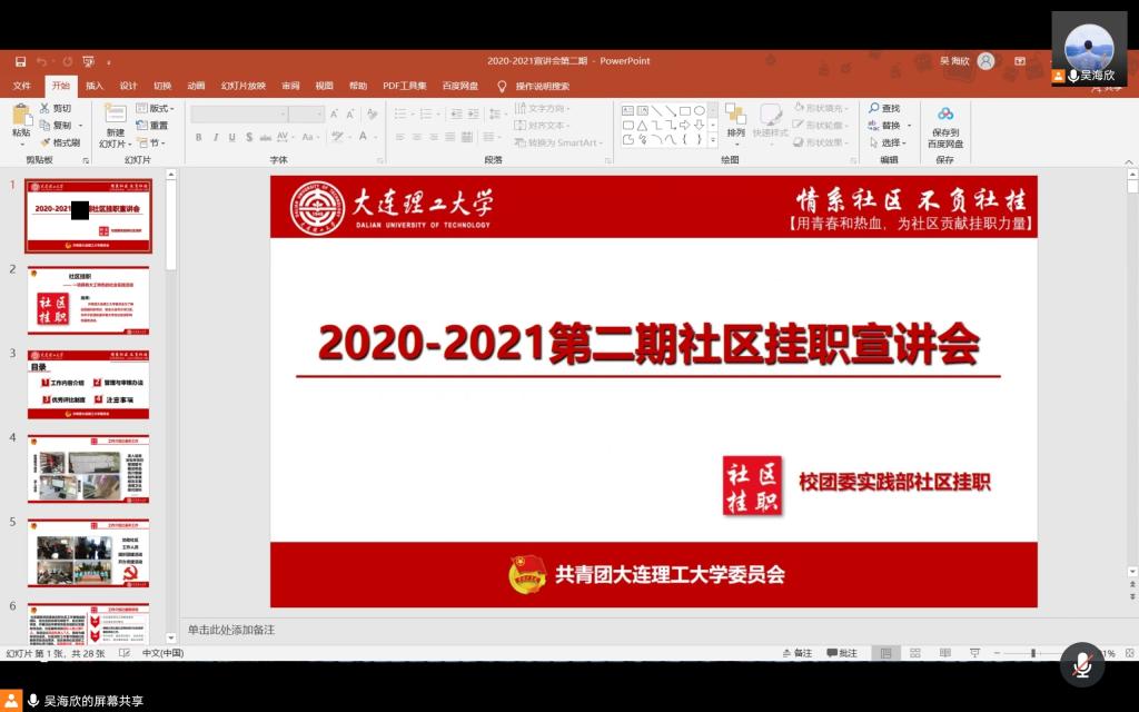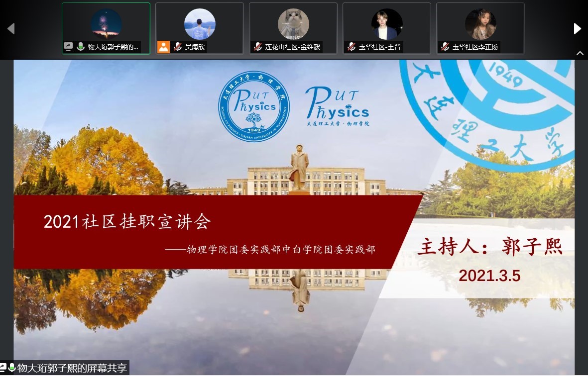 202135日晚7时,物理学院顺利在腾讯会议平台上举办线上社区挂职培训会。本次会议由物理学院团委实践部承办,实践部志愿者郭子熙担任主持人。