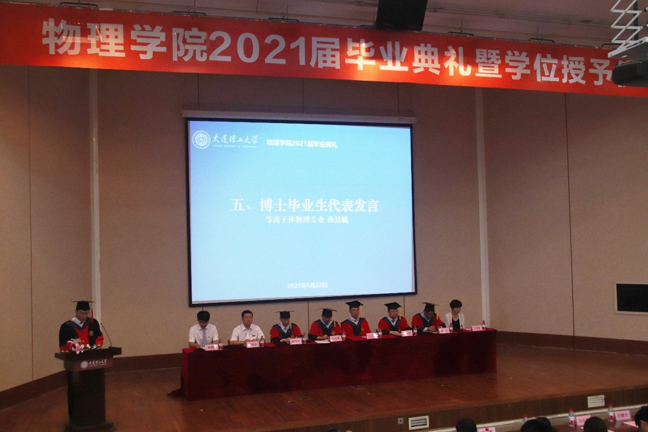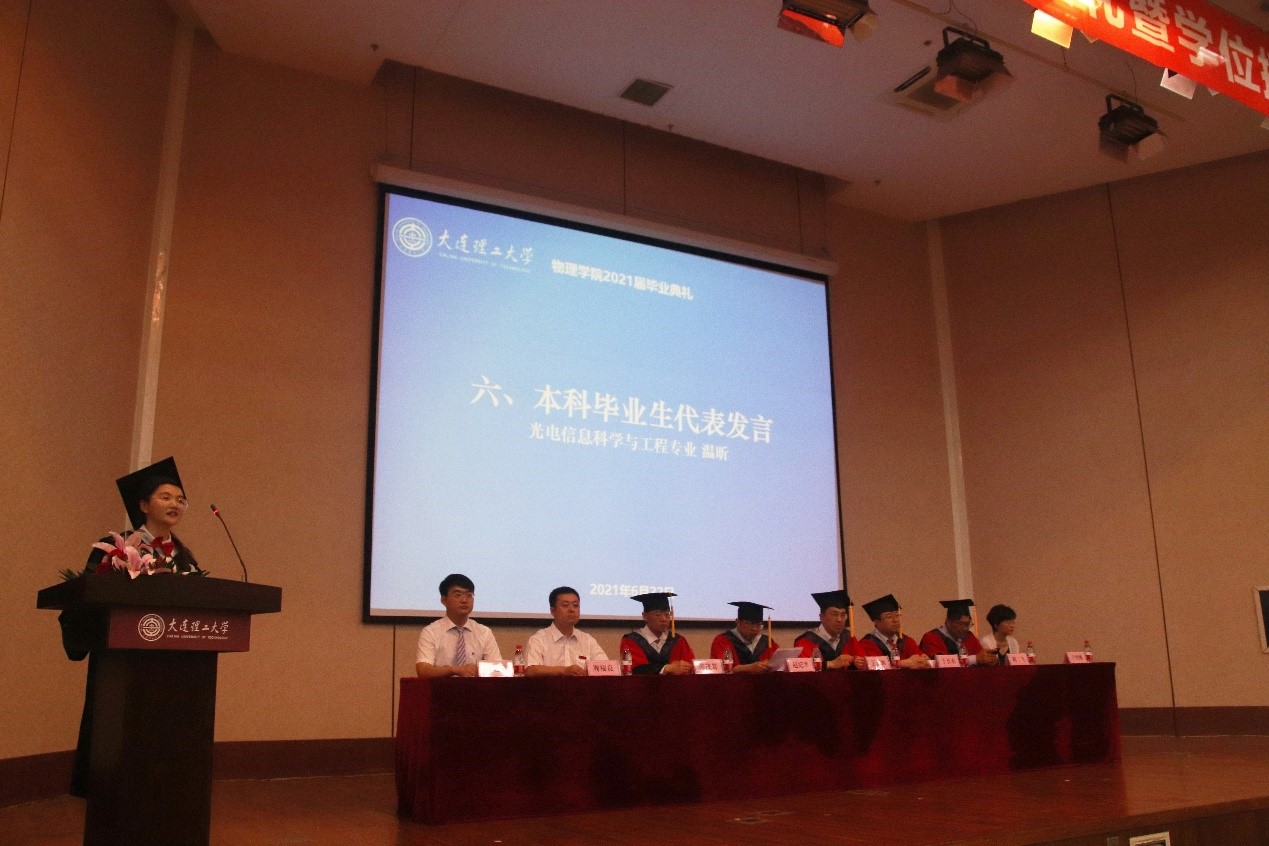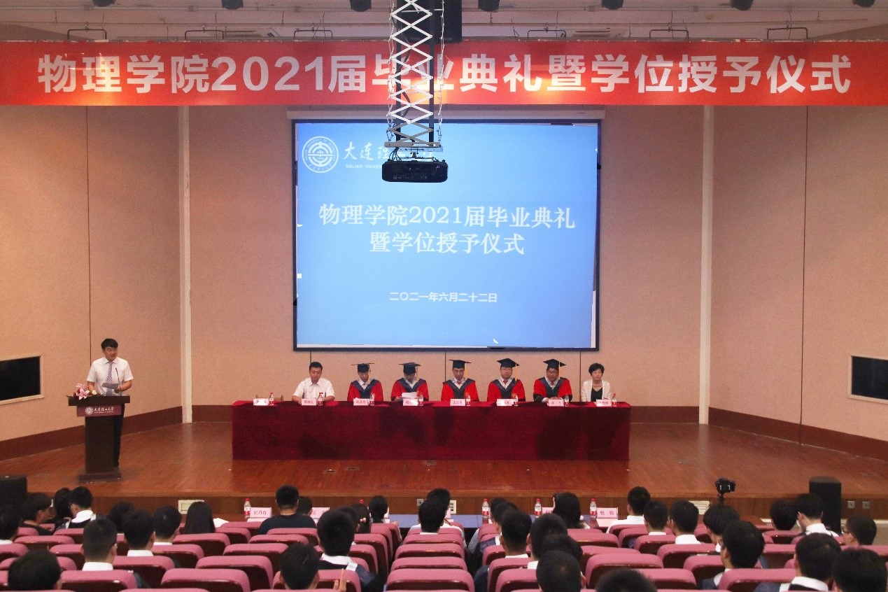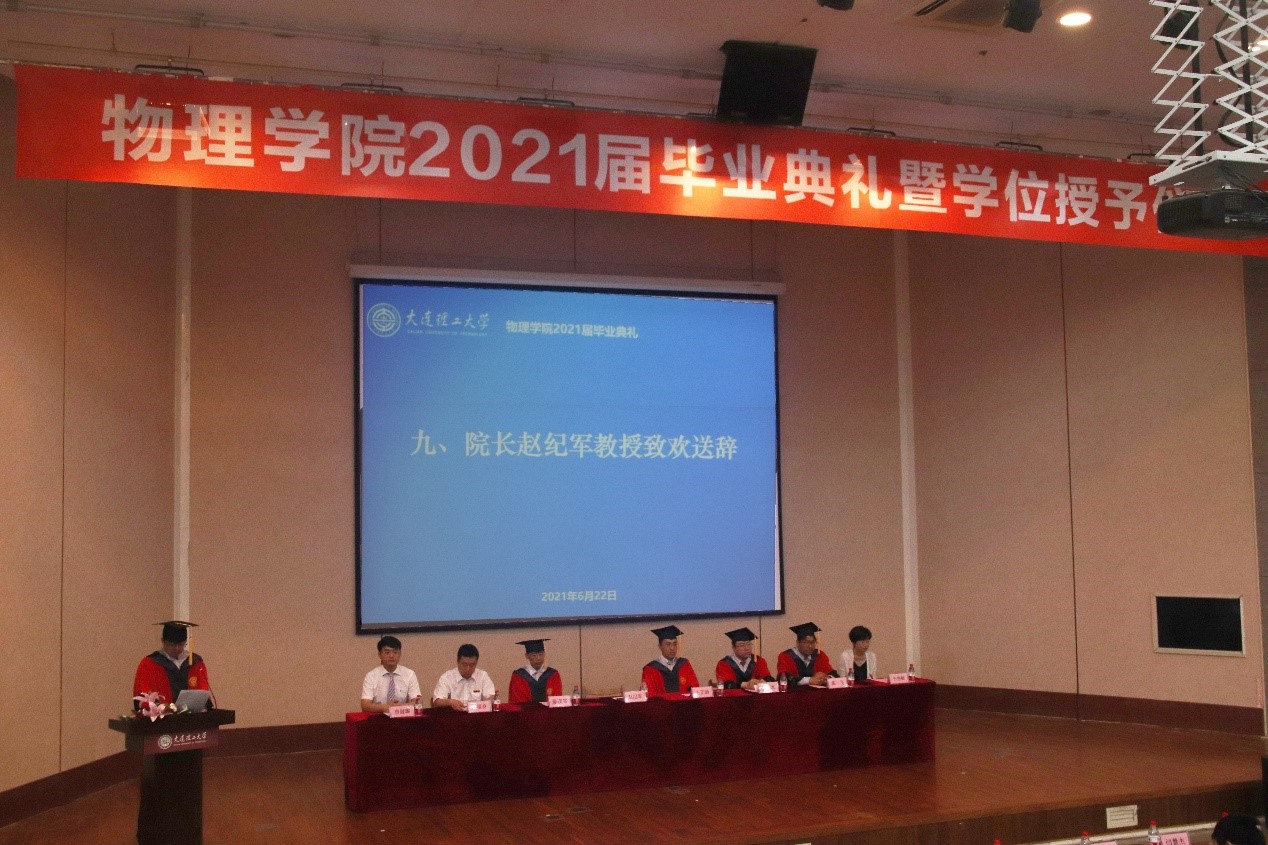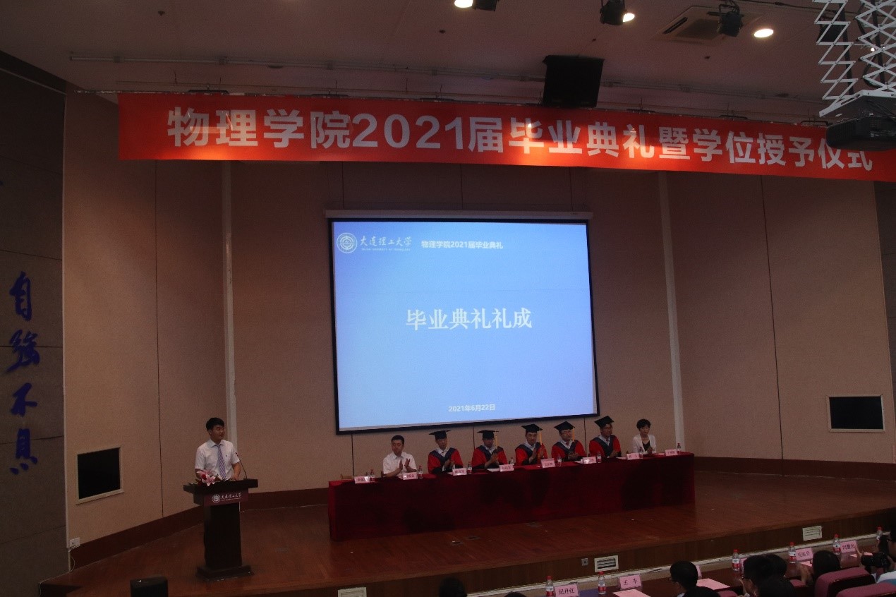 夏季逾至,又逢毕业季。物理学院2021届毕业生即将离开大工,开启新的旅程。2021年6月22日上午9时,物理学院2021届毕业典礼暨学位授予仪式在研教楼报告厅成功举行。出席的嘉宾有物理学院院长赵纪军教授、党委书记王正汹教授、副院长陈茂笃教授、副院长于长水教授、副院长高飞教授、党委副书记兼副院长周福良老师、党委副书记兼副院长于艳敏老师、学生工作办公室主任纪丹红老师、研究生辅导员张弛老师。此外,本次典礼也面向本科生思政班主任、专业班主任发出邀请。物1703班思政班主任赫铭老师、物1701班思政班主任邬霞老师、物大珩1701班思政班主任应兆升老师、物1702班专业班主任副教授王丰老师、物1703班专业班主任闫慧杰老师参与本次物理学院的毕业典礼。2021届本科毕业生辅导员唐健璐老师担任主持人。