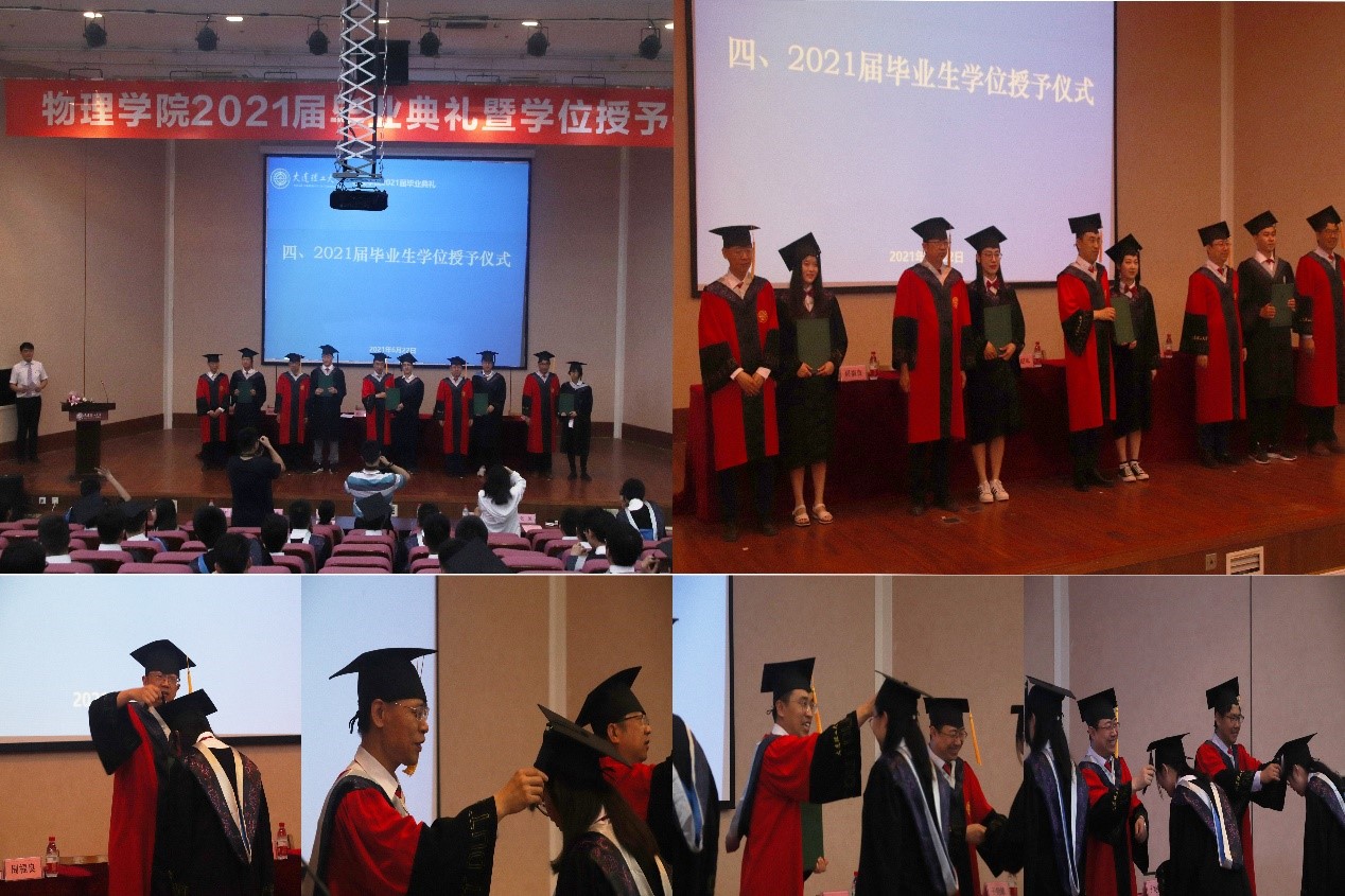 物理学院2021届毕业生共有194名。赵纪军教授、王正汹教授、陈茂笃教授、于长水教授、高飞教授,五位教授为毕业生授予学位。毕业生们依次上台,接受着教授们的拨穗礼,然后郑重接过教授手里的学位证书,被授予着学位的头衔,这也意味着他们学海人生中一个阶段的完美结束。最后同学们与老师合影,纪念这庄严荣耀的仪式。