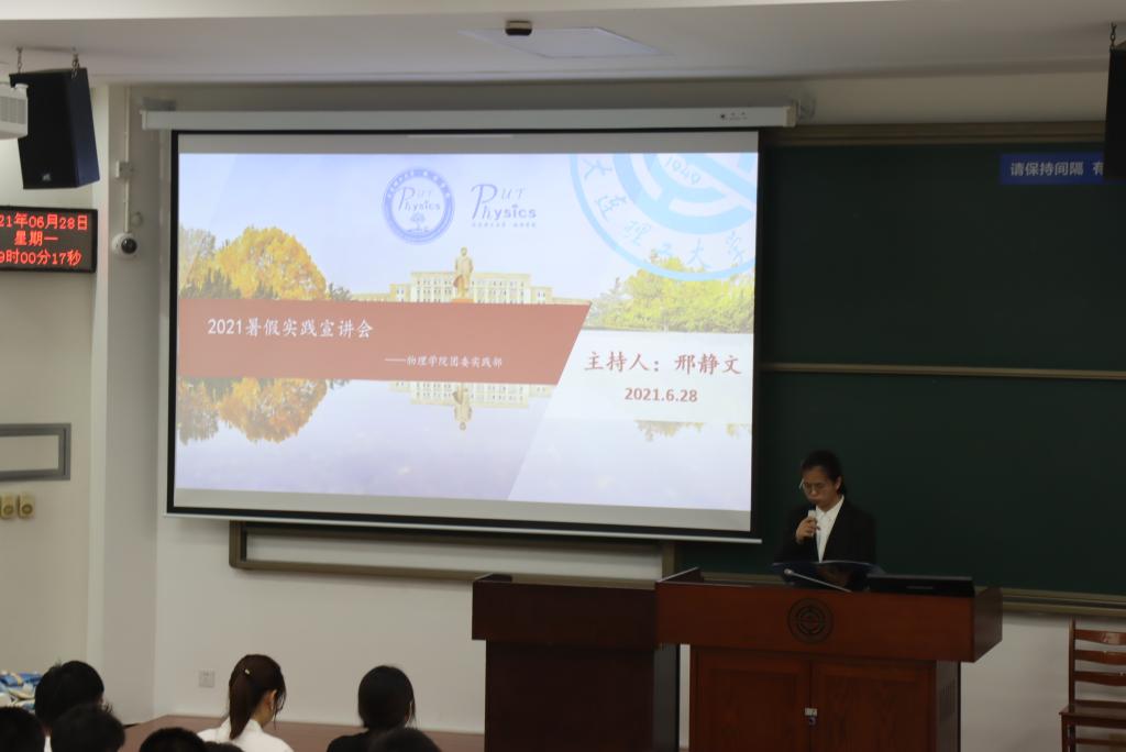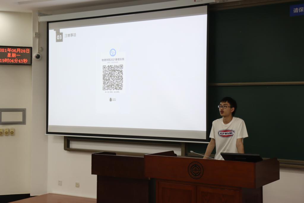 2021年6月28日19:00,2021年物理学院暑期社会实践宣讲会在综合一号教学楼152教室成功举办,本着培养同学们实践精神、增加同学们实践能力的目的,实践部的工作人员们为物理学院的同学们讲述了社会实践的要求以及注意事项。本次活动由来自实践部的邢静文同学担任主持人。