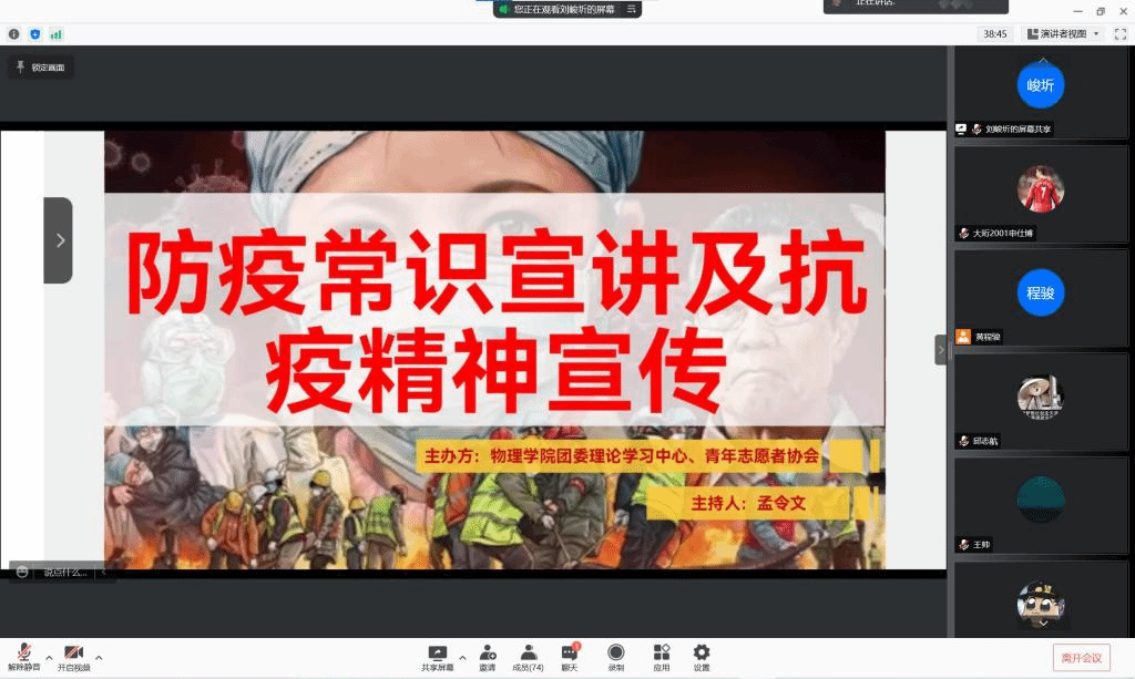 寒冬初至,疫情再次袭来,为学习防疫常识,弘扬抗疫精神,我们相约线上,召开了此次会议。本次宣讲会由来自理论宣传中心的孟令文同学主持,由邱志航同学和刘泽璇同学分别进行了宣讲,参加本次宣讲的还有物理学院大一全体同学。