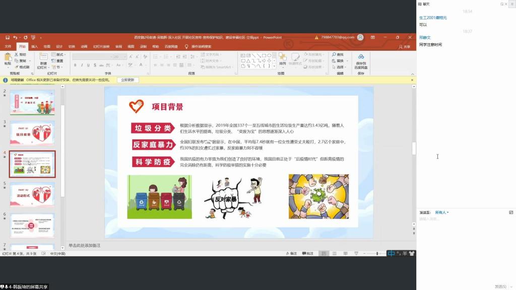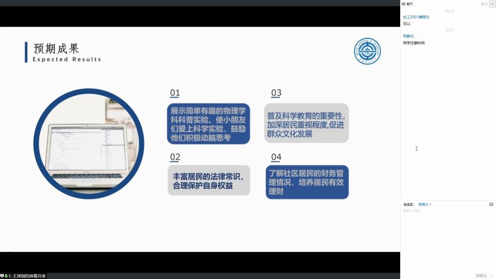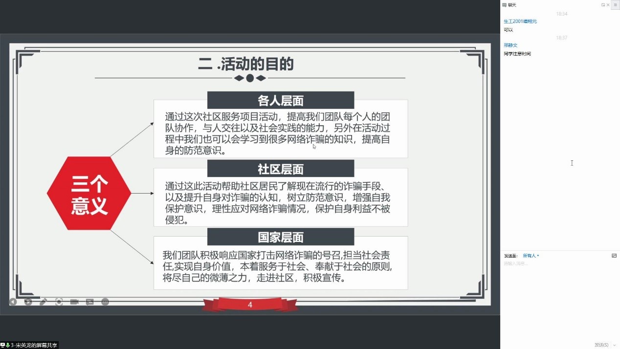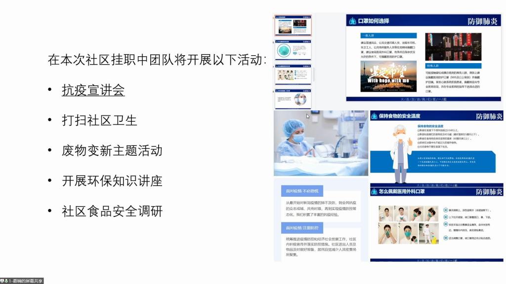 本次答辩共五支队伍参加,分别有4支队伍主题为深入社区,开展社区宣传1支队伍主题为调研社区,服务社区发展。服务团队围绕全面建成小康社会、共抗疫情贡献青年力量、垃圾分类助力文明城市等核心思想,精心策划,并针对活动的具体形式,活动时间及方案等做出详细介绍。宣传类社区服务项目主要有举办社区宣讲,,制作宣传手册,张贴宣传海报、条幅,拍摄心理剧等精彩项目;调研类服务项目则有线上调查问卷,开展物理知识科普,走访社区调查等细致规划。评委们认真听取各支队伍的精彩发言,并针对活动可行性及活动预期成果做出提问及点评。